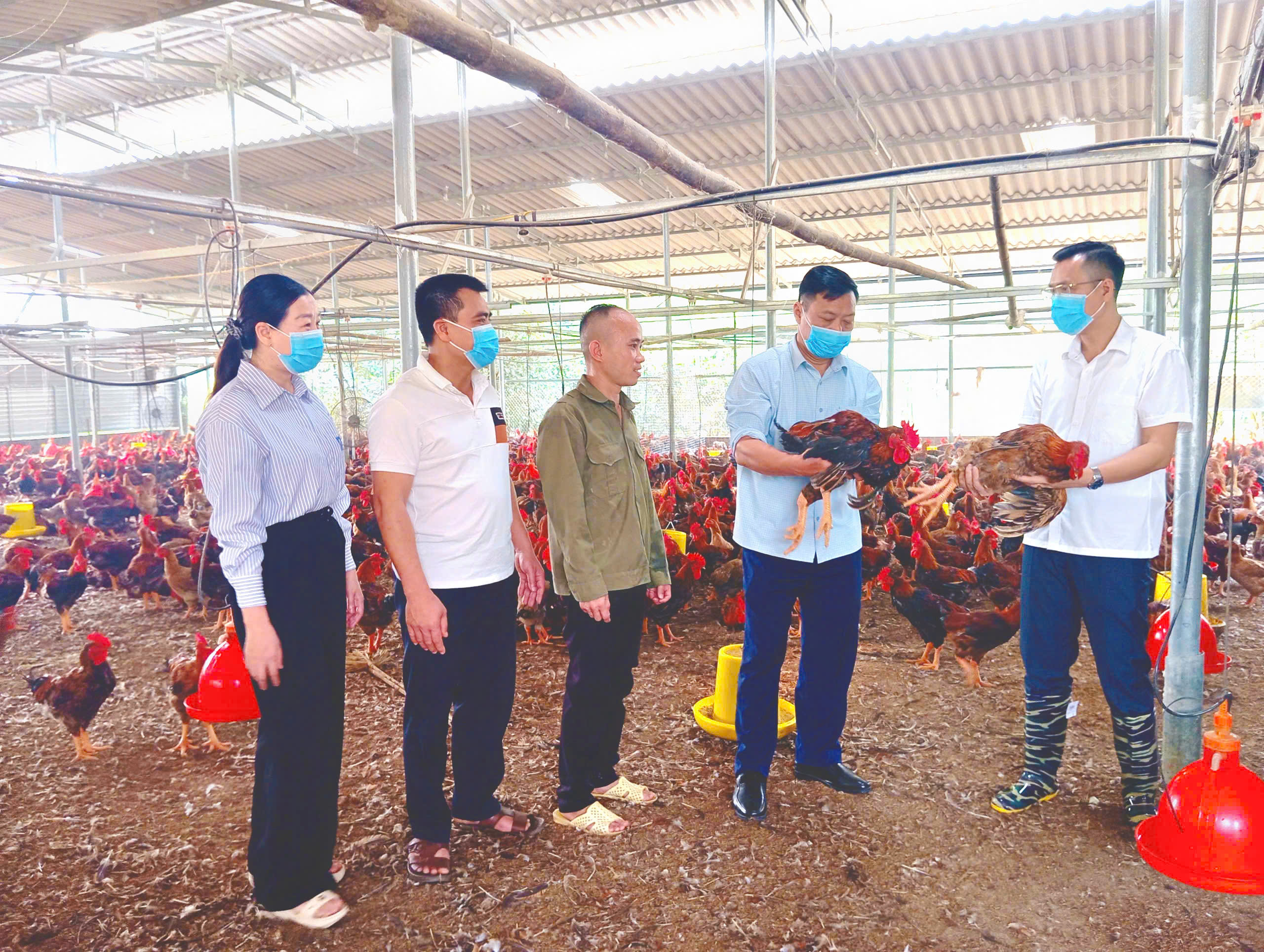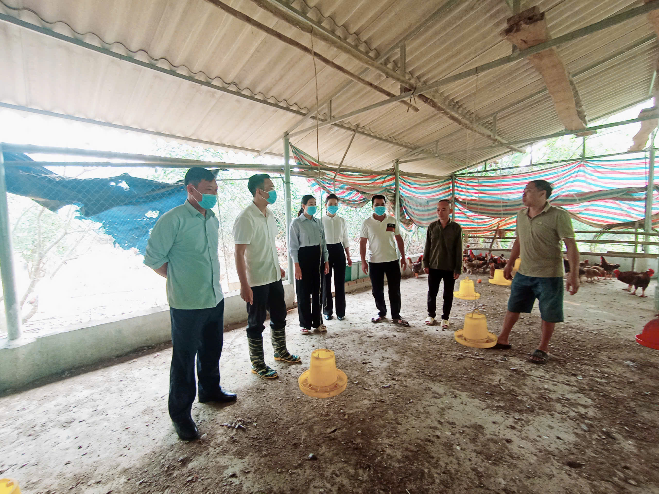 Đồng chí Trần Trọng Phi Trường, Phó Bí thư Đảng ủy xã, Chủ tịch UBND xã cùng các đồng chí trong đoàn công tác, chủ mô hình đang trao đổi về kỹ thuật xử lý chuồng gà để chuẩn bị úm gà con.