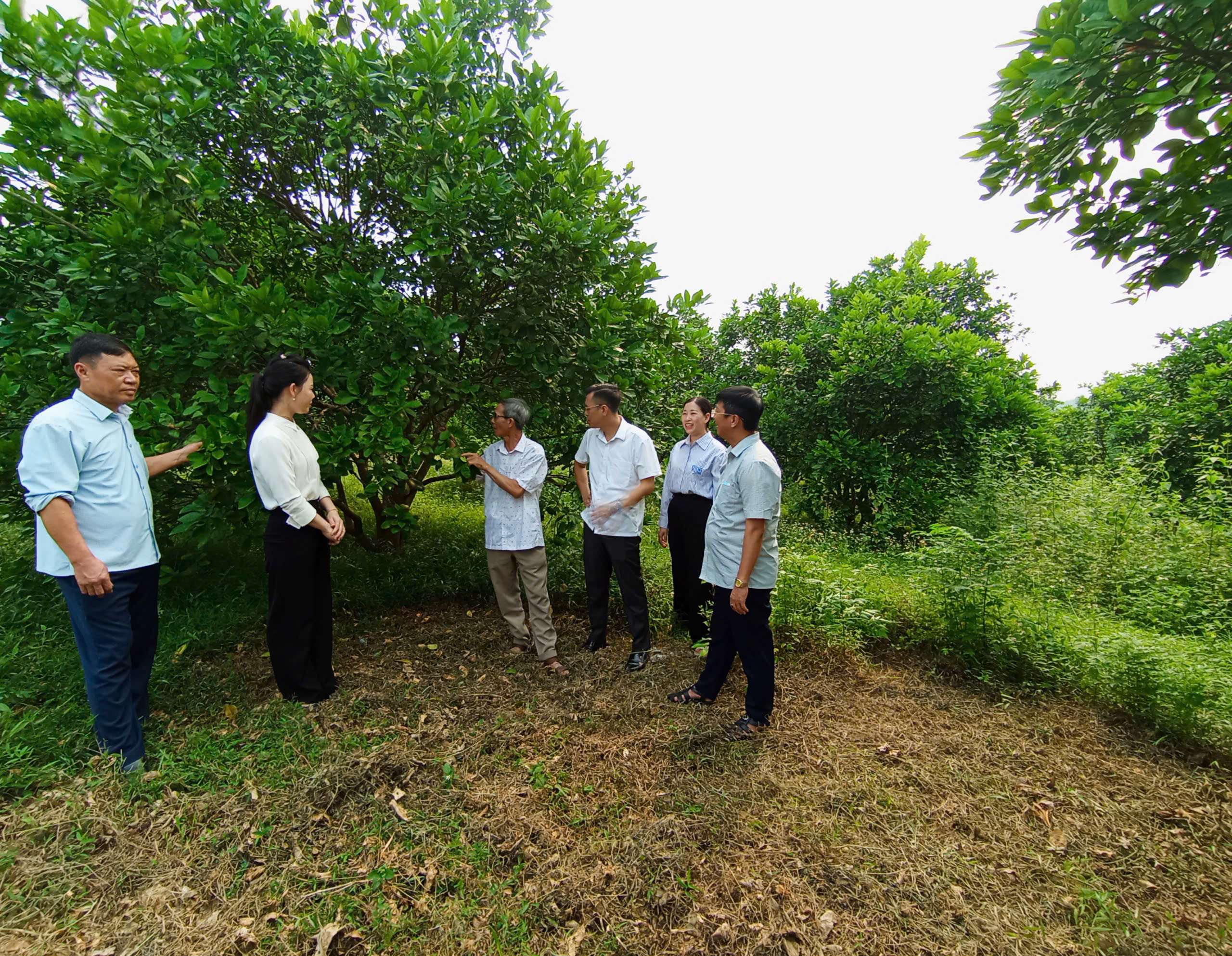 Đồng chí Trần Trọng Phi Trường, Phó Bí thư Đảng ủy xã, Chủ tịch UBND xã cùng các đồng chí trong đoàn công tác tại nhà ông Nguyên Văn Cường thôn An Lịch đang trao đổi mô hình trồng chanh tứ thì, bưởi Soi Hà.