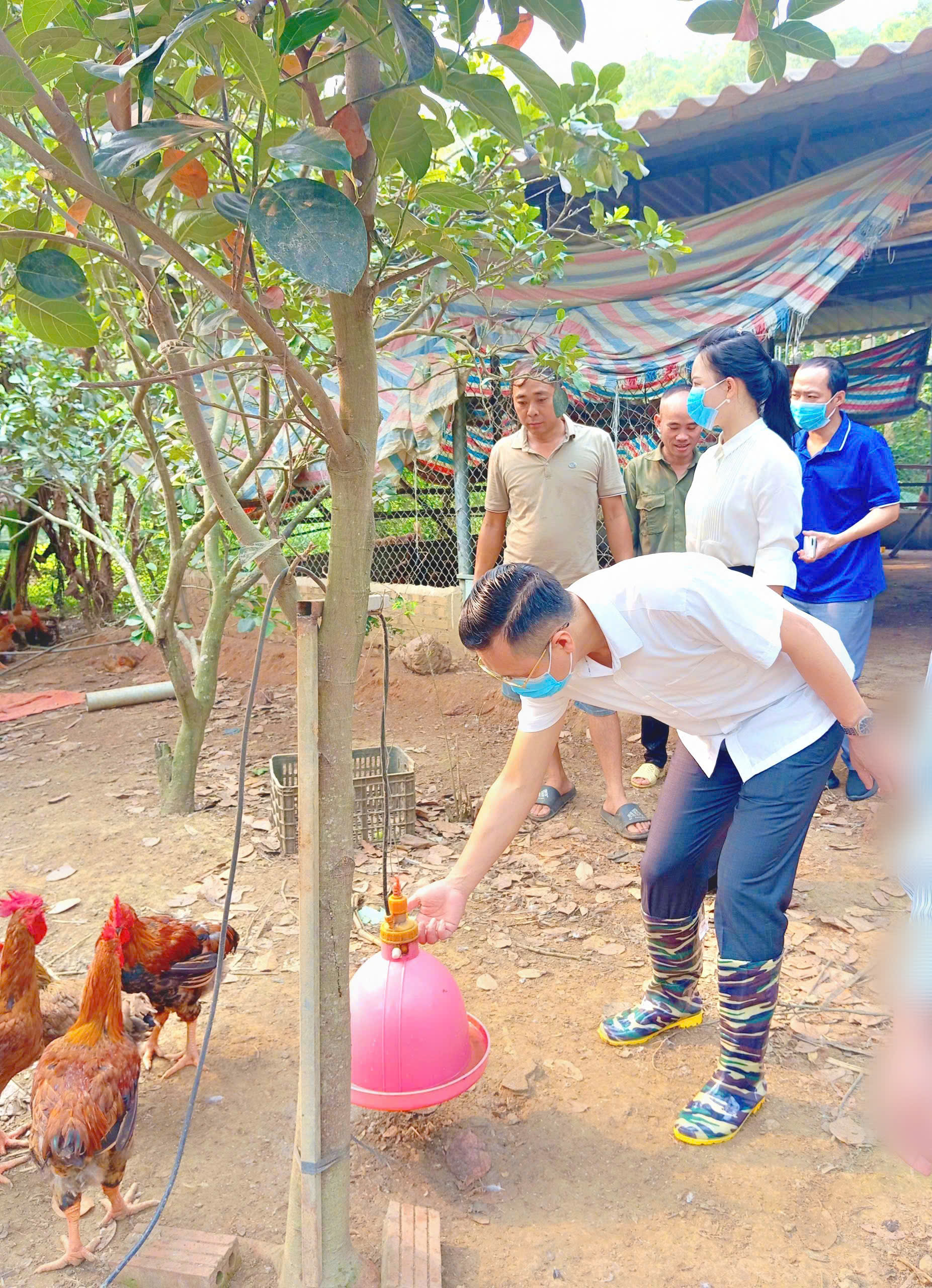 Đồng chí Trần Trọng Phi Trường, Phó Bí thư Đảng ủy xã, Chủ tịch UBND xã kiểm tra hệ thống nước uống tự động cho gà ngoài vườn.