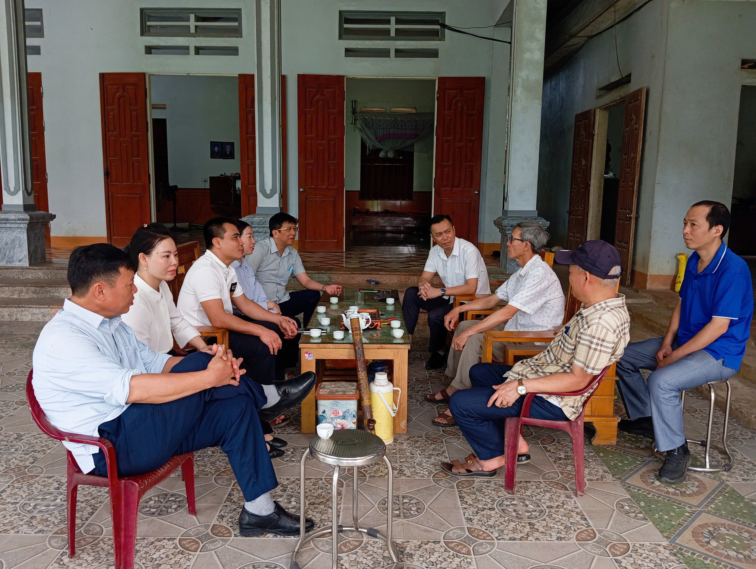 Đồng chí Trần Trọng Phi Trường, Phó Bí thư Đảng ủy xã, Chủ tịch UBND xã cùng các đồng chí trong đoàn công tác, chủ mô hình đang trao đổi về chăn nuôi gà lai hồ thả vườn.