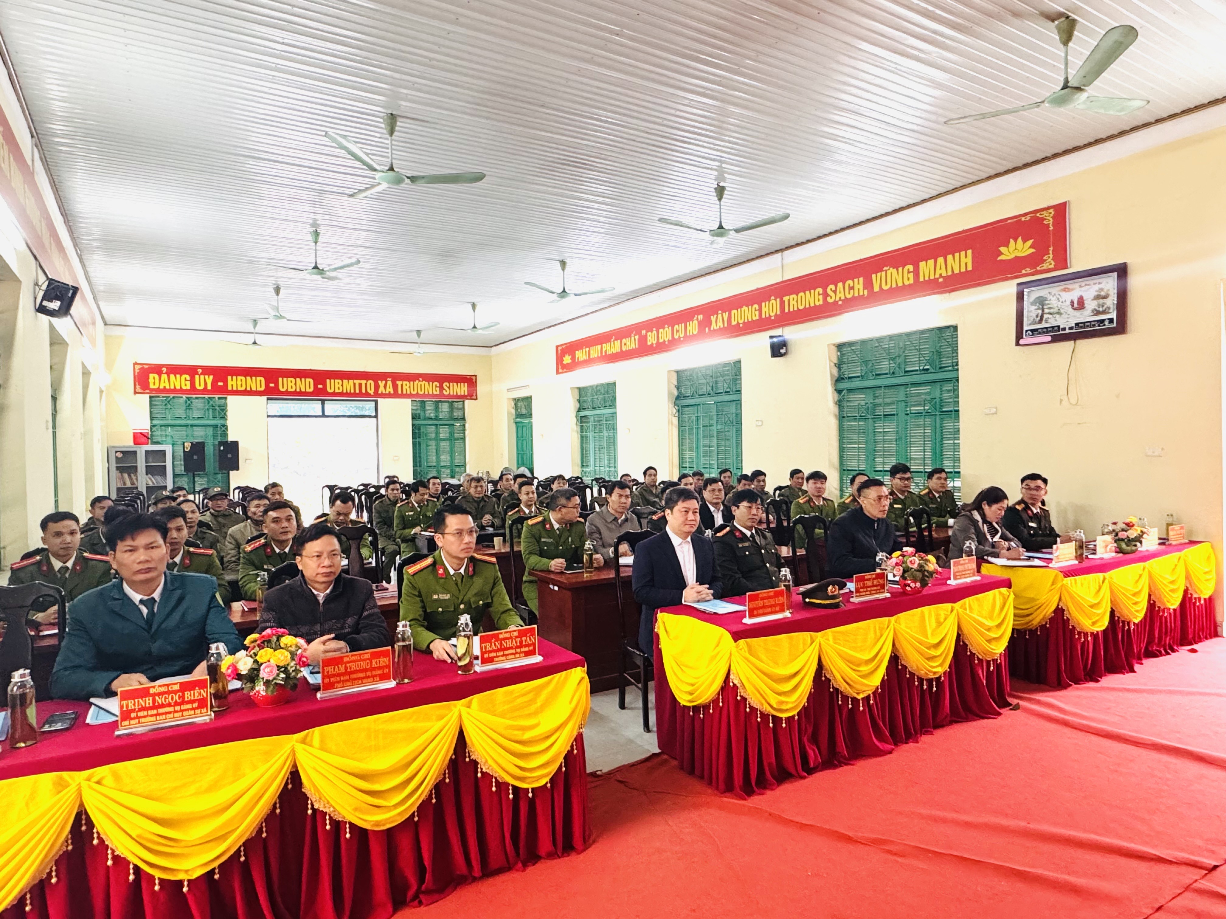 Đồng chí Đại tá Lục Thế Hưng, Phó Bí thư Đảng ủy, Phó Giám đốc Công an tỉnh; đ/c Nguyễn Trung Kiên - Bí thư Đảng ủy xã; đ/c Dương Thị Phương Nhung, Phó Bí thư Thường trực Đảng ủy, Chủ tịch HĐND xã; đ/c Trần Trọng Phi Trường, Phó bí thư Đảng ủy, Chủ tịch UBND xã cùng các đồng chí trong Ban thường vụ Đảng ủy, Chỉ huy, CBCS Công an xã, đại diện 34 Tổ bảo vệ ANTT dự Hội nghị