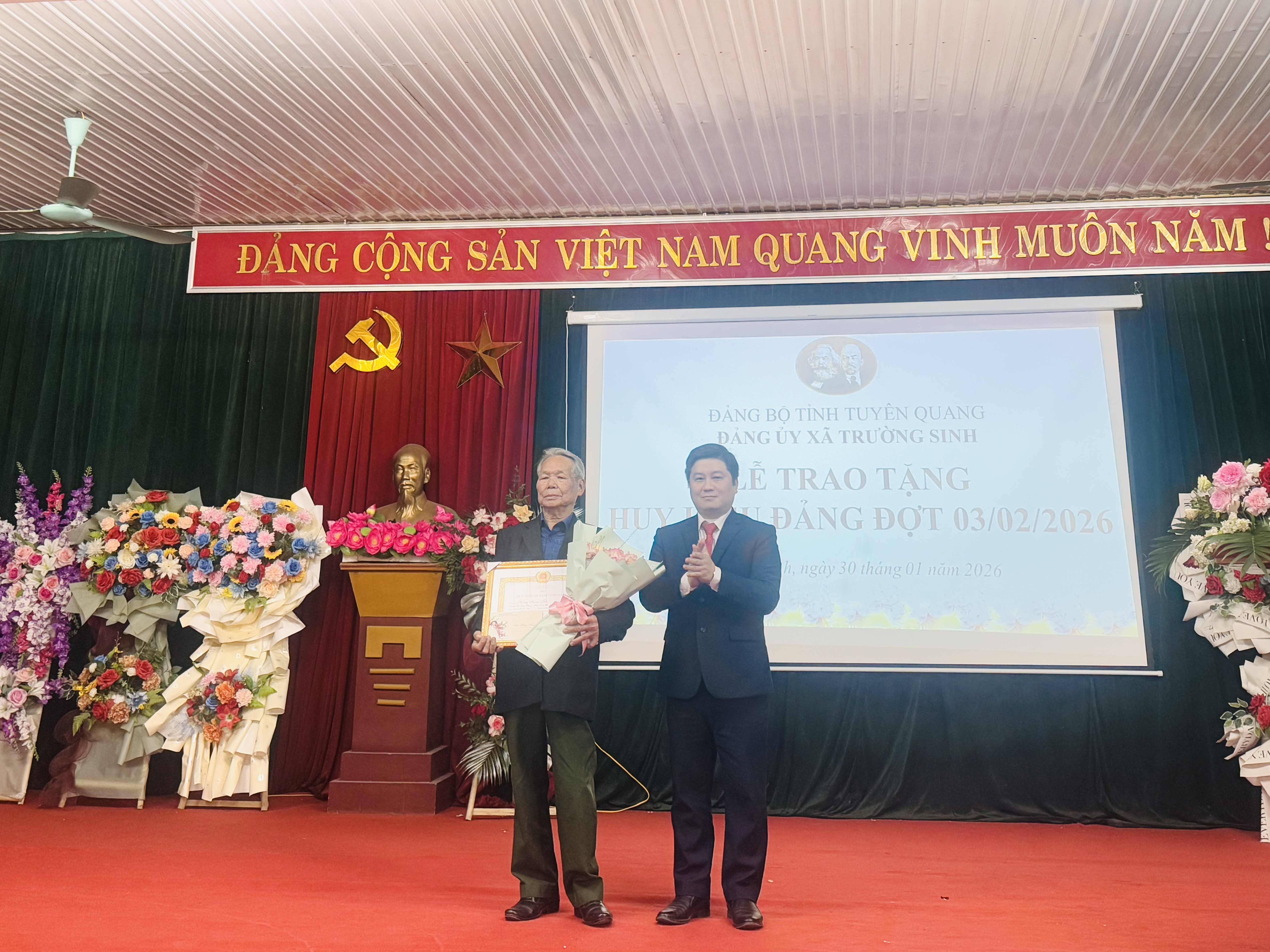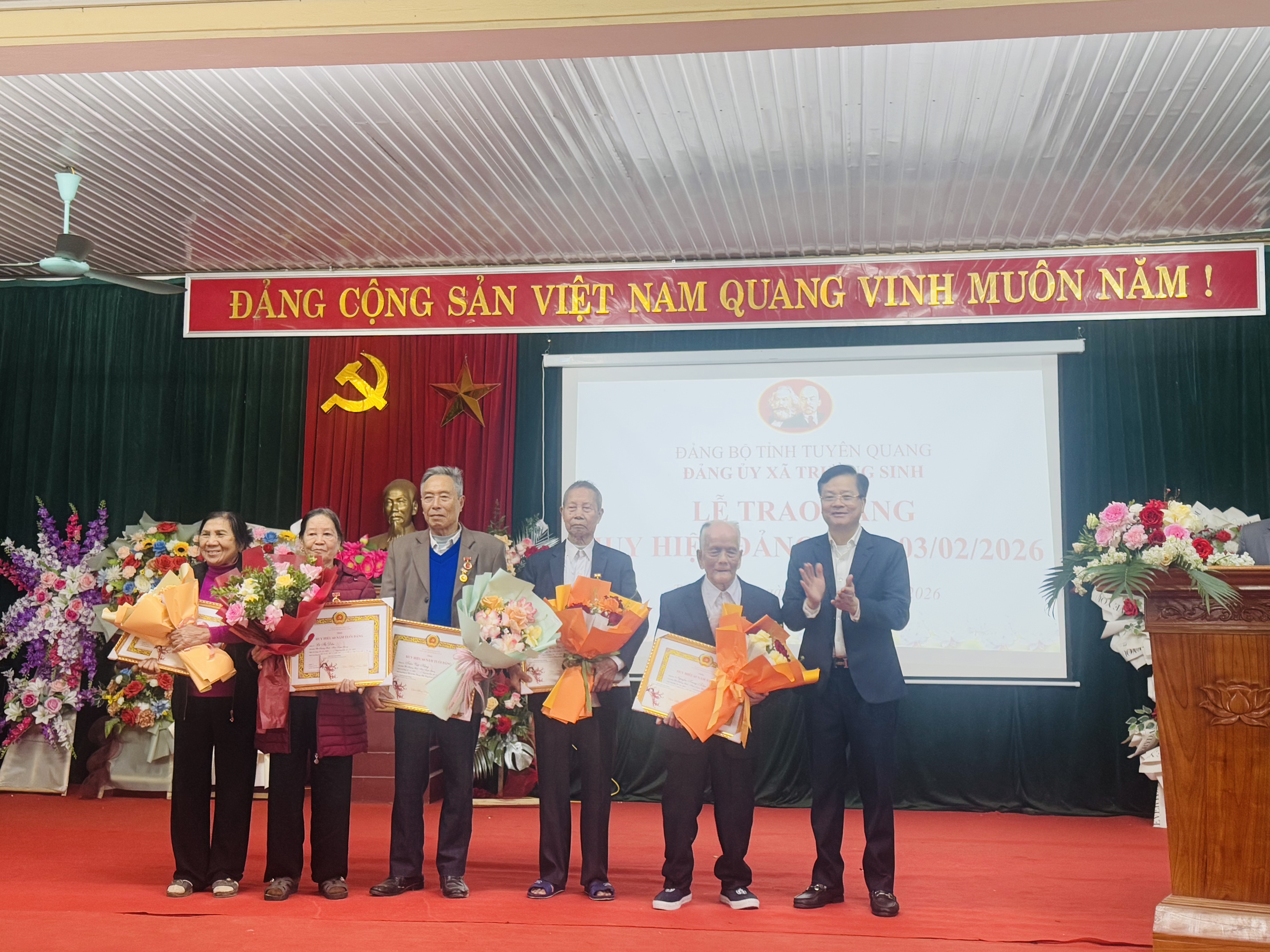 Chiều ngày 30/01/2026, tại Nhà văn hóa xã Trường Sinh. Đảng ủy xã tổ chức Lễ trao tặng Huy hiệu Đảng đợt 03/02/2026 cho các đồng chí được trao tặng 65, 60,55,45,40 năm tuổi đảng. Dự và chỉ đạo buổi lễ trao tặng Huy hiệu Đảng có đ/c Trần Quang Minh Ủy viên Ban Thường vụ tỉnh ủy, Trưởng ban Tổ chức Tỉnh ủy; đ/c Phạm Kiều Vân, Ủy viên Ban Chấp hành Đảng bộ tỉnh, Giám đốc sở tài chính tỉnh; đ/c Nguyễn Trung Kiên, Bí thư Đảng ủy xã; đ/c Dương Thị Phương Nhung, Phó Bí thư Thường trực Đảng ủy, Chủ tịch HĐND xã; đ/c Trần Trọng Phi Trường, Phó Bí thư Đảng ủy, Chủ tịch Ủy ban nhân dân xã.