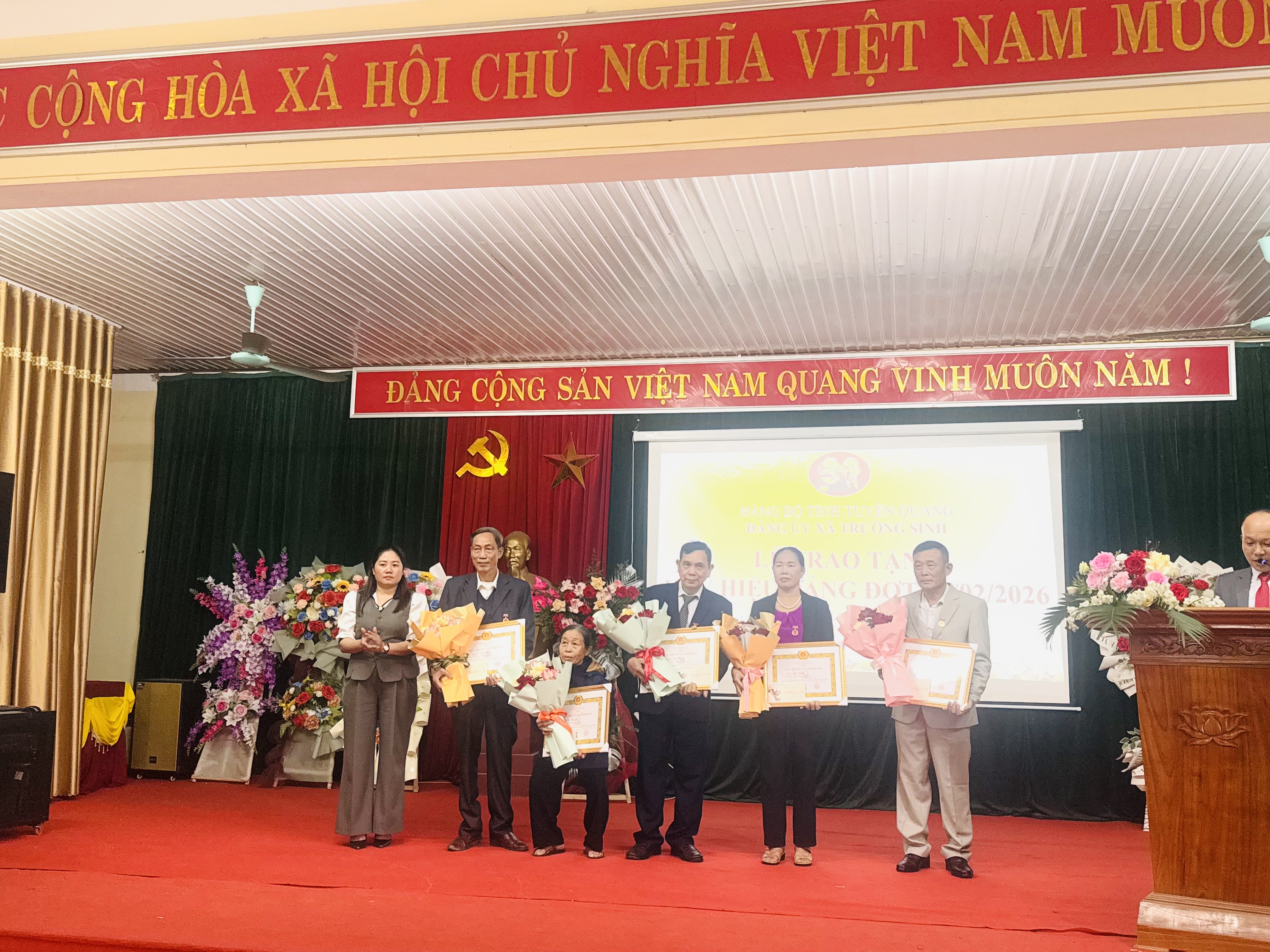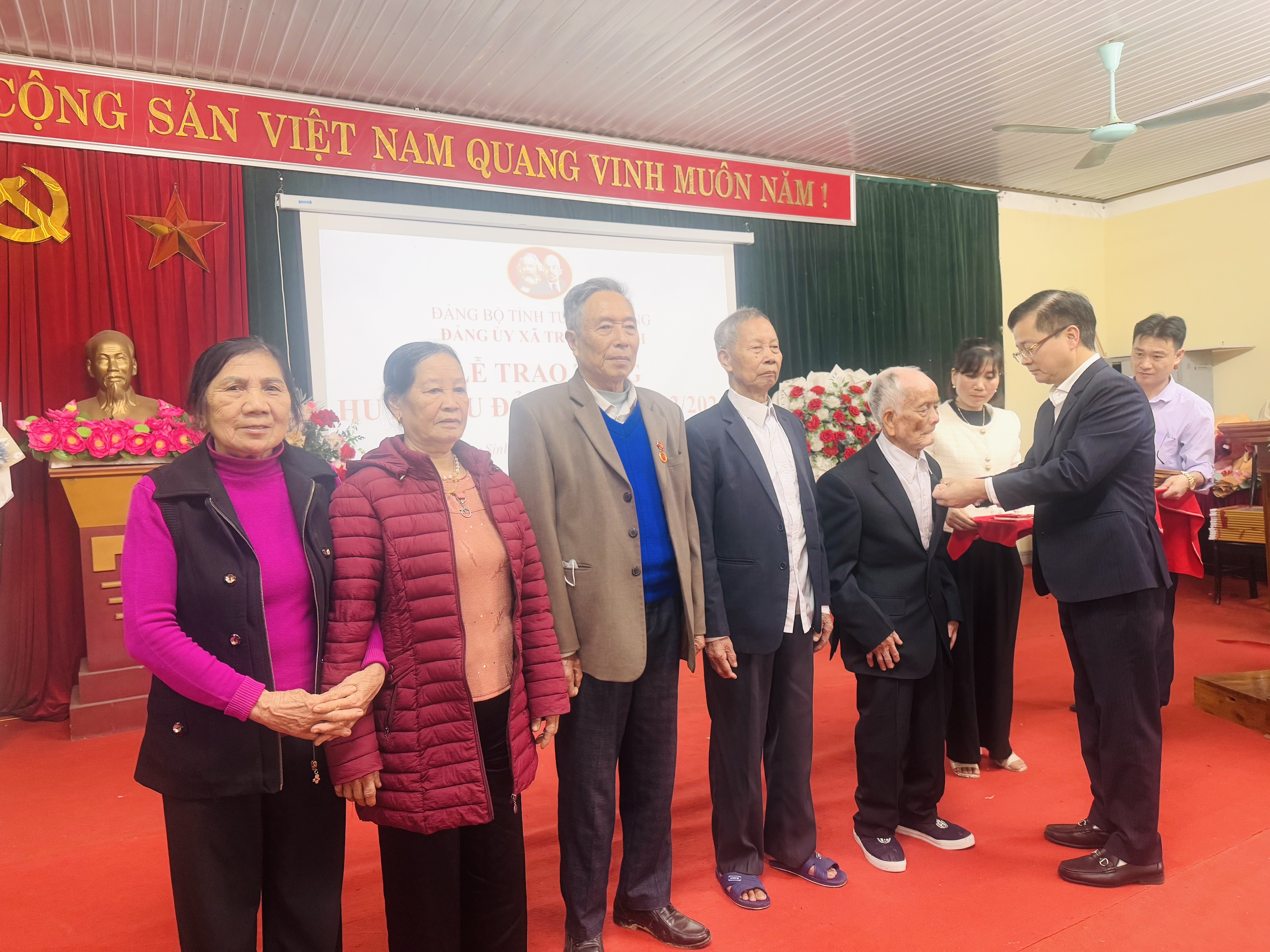 Tại buổi lễ đã trao tặng Huy hiệu Đảng cho 20 đồng chí vinh dự được trao tặng 65, 60, 55,45,40 năm tuổi đảng, gồm các đồng chí sau: 1. Đ/c Nguyễn Trọng Toàn, Đảng viên CB thôn An Lịch: 65 năm tuổi Đảng; 2. Đ/c Lê Thị Điền, Đảng viên CB thôn Quang Tất: 60 năm tuổi Đảng; 3. Đ/c Trần Việt Hùng, Đảng viên CB thôn Quang Tất: 60 năm tuổi Đảng; 4. Đ/c Cao Văn Thiều, Đảng viên CB thôn Lương Thiện: 60 năm tuổi Đảng; 5.Đ/c Đỗ Văn Lận, Đảng viên CB thôn An Thịnh: 60 năm tuổi Đảng; 6. Đ/c Vũ Thị Khương, Đảng viên CB thôn An Thịnh: 60 năm tuổi Đảng; 7. Đ/c Hoàng Trọng Thủ, Đảng viên CB thôn Thọ Đức: 55 năm tuổi Đảng; 8.Đ/c Vũ Thị Hoãn, Đảng viên CB thôn Thắng Lợi: 45 năm tuổi Đảng; 9.Đ/c Nguyễn Hữu Thơm, Đảng viên CB thôn Phú Thịnh: 45 năm tuổi Đảng; 10. Đ/c Đinh Thị Thắm, Đảng viên CB thôn Trại Mít: 45 năm tuổi Đảng; 11. Đ/c Nguyễn Văn Thắng, Đảng viên CB thôn Quyết Tiến: 45 năm tuổi Đảng; 12. Đ/c Nguyễn Văn Hùng, Đảng viên CB thôn Quyết Tiến: 45 năm tuổi Đảng; 13. Đ/c Nguyễn Văn Liên, Đảng viên CB thôn Phú Thịnh: 40 năm tuổi Đảng; 14. Đ/c Nguyễn Thị Hào, Đảng viên CB thôn Trại Mít: 40 năm tuổi Đảng; 15. Đ/c Đinh Văn Hà, Đảng viên CB thôn Đồng Tâm: 40 năm tuổi Đảng; 16. Đ/c Nguyễn Hải Quảng, Đảng viên CB thôn Phú Thịnh: 40 năm tuổi Đảng; 17. Đ/c Nguyễn Thị Năm, Đảng viên CB thôn Phú Thịnh 1: 40 năm tuổi Đảng; 18. Đ/c Đỗ Văn Tiến, Đảng viên CB thôn Đồng Tâm 1: 40 năm tuổi Đảng; 19. Đ/c Nguyễn Trung Kiên, Đảng viên CB thôn Hưng Định: 40 năm tuổi Đảng; 20. Đ/c Trần Thị Cấp, Đảng viên CB thôn Phú Thọ 2: 40 năm tuổi Đảng.
