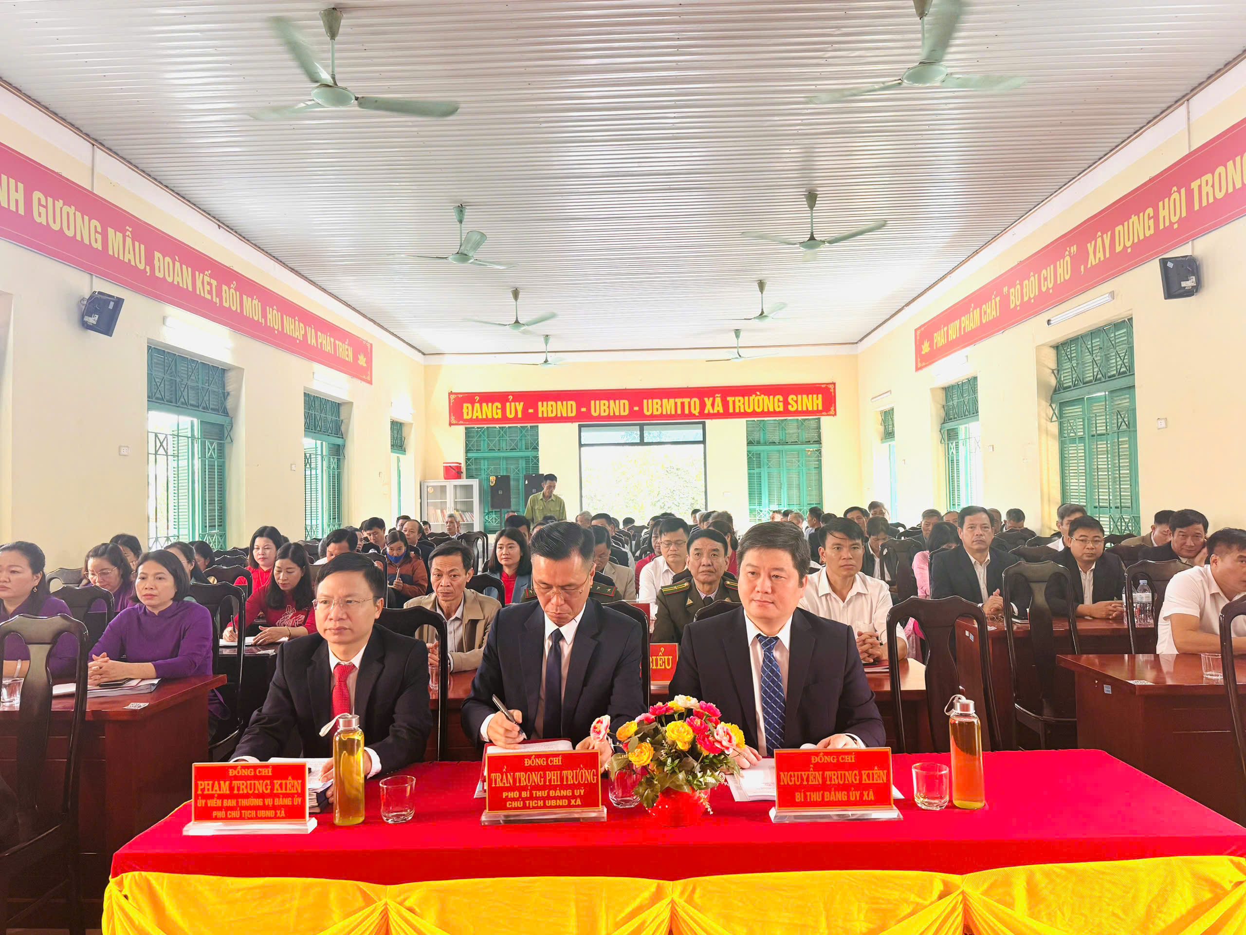 Đ/c Nguyễn Trung Kiên, Bí thư Đảng ủy xã; Đ/c Dương Thị Phương Nhung, Phó Bí thư Thường trực Đảng Ủy, Chủ tịch Hội đồng nhân dân xã; Đ/c Trần Trọng Phi Trường, Phó Bí thư Đảng Ủy, Chủ tịch Ủy ban nhân dân xã cùng các đồng chí trong Ban thường vụ Đảng ủy, Thường trực HĐND xã, lãnh đạo UBND xã và các đại biểu dự kỳ họp
