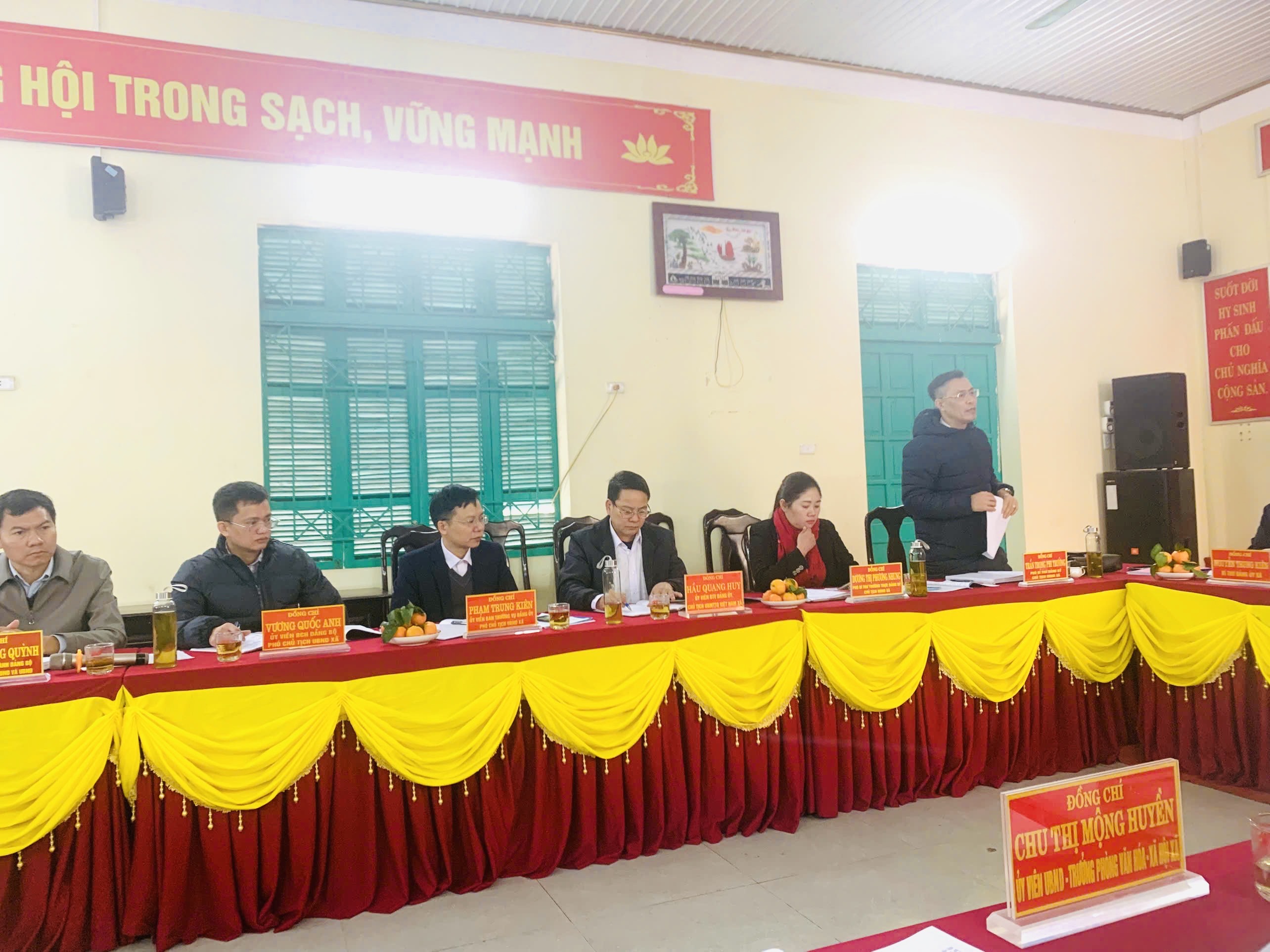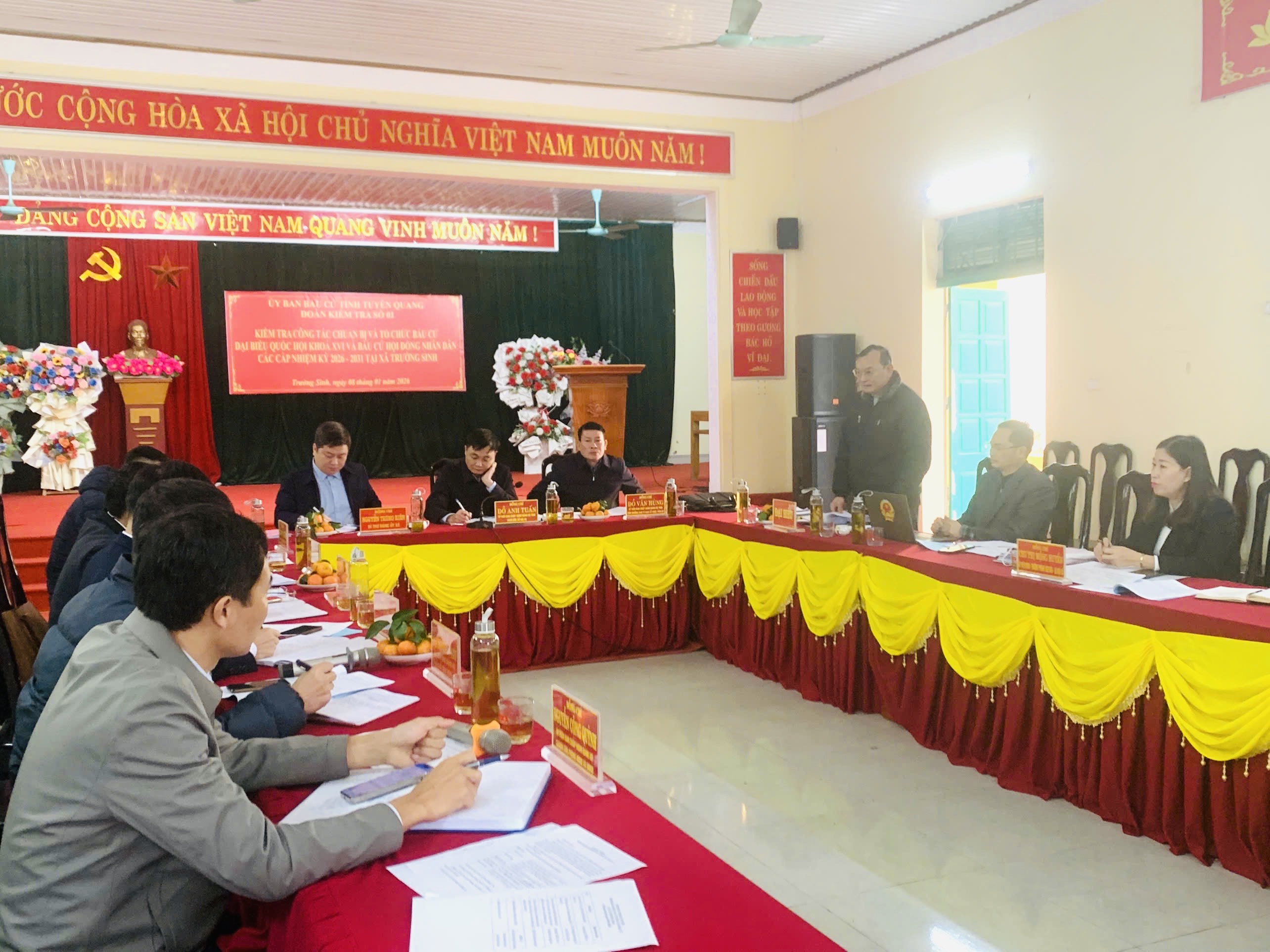 Hôm nay, ngày 08/1/2026 tại Nhà văn hóa xã Trường Sinh, Đoàn kiểm tra số 01 của Ủy ban bầu cử tỉnh kiểm tra công tác bầu cử tại xã Trường Sinh. đoàn kiểm tra gồm các đồng chí Đỗ Anh Tuấn, Tỉnh ủy viên, Giám đốc Sở Nội vụ kiêm thư ký UBBC tỉnh, Tổ trưởng tổ công tác số 3; đ/c Đỗ văn Hùng, Tỉnh ủy viên, Phó trưởng ban Thường trực Ban Tổ chức Tỉnh ủy, Ủy viên UBBC tỉnh, Tổ trưởng Tổ công tác số 1; đ/c Nguyễn Văn Tôn, Trưởng phòng Chính quyền địa phương, Sở Nội vụ, thư ký đoàn kiểm tra số 1; đ/c Trần Thị Hải Yến, Phó trưởng phòng Tổ chức cán bộ, Ban Tổ chức Tỉnh ủy, Thành viên Tổ công tác số 1; đ/c Phạm Đức Tài, Chuyên viên chính phòng Chính quyền địa phương, Sở Nội vụ, Thư ký Tổ công tác số 3;