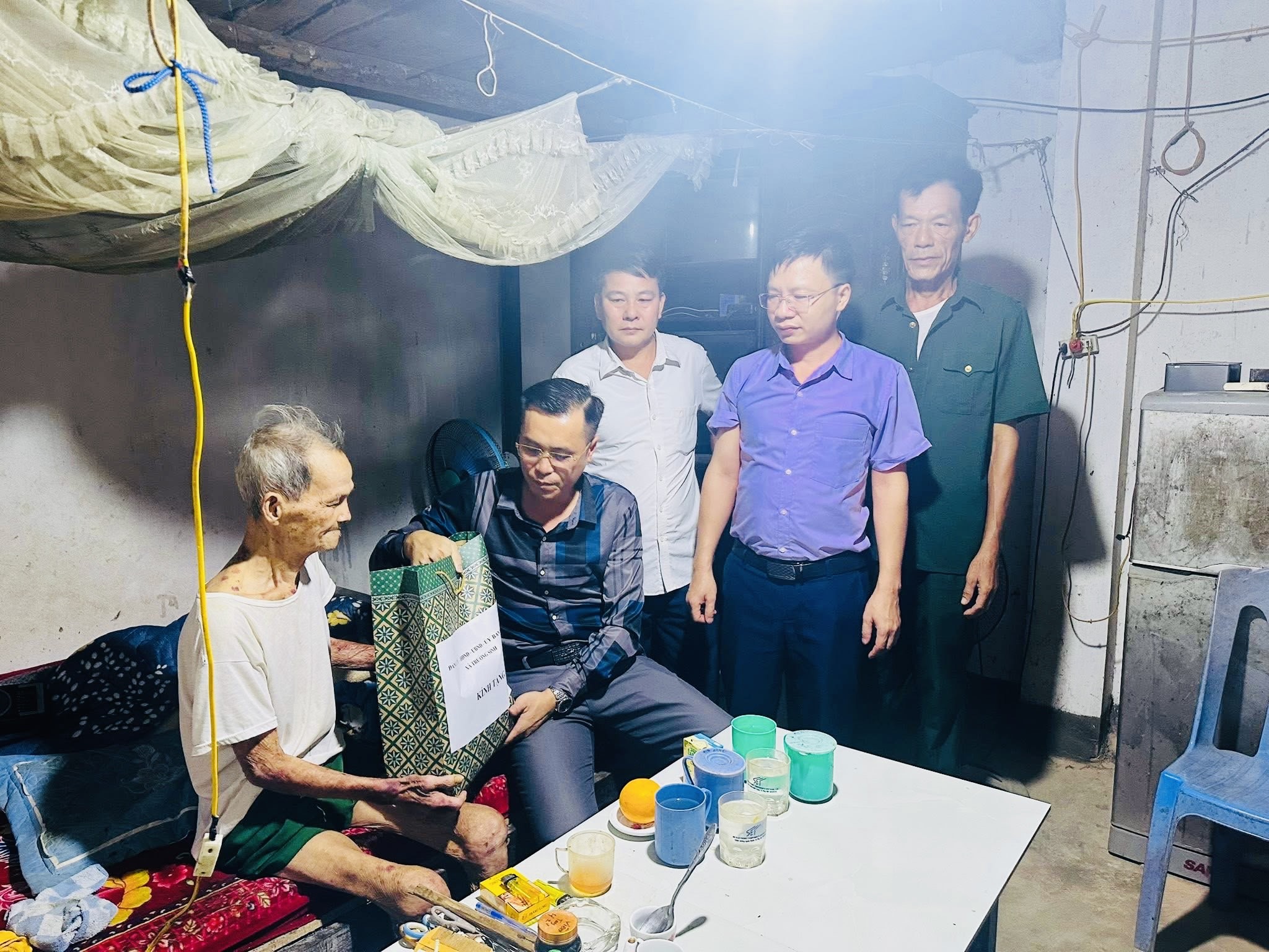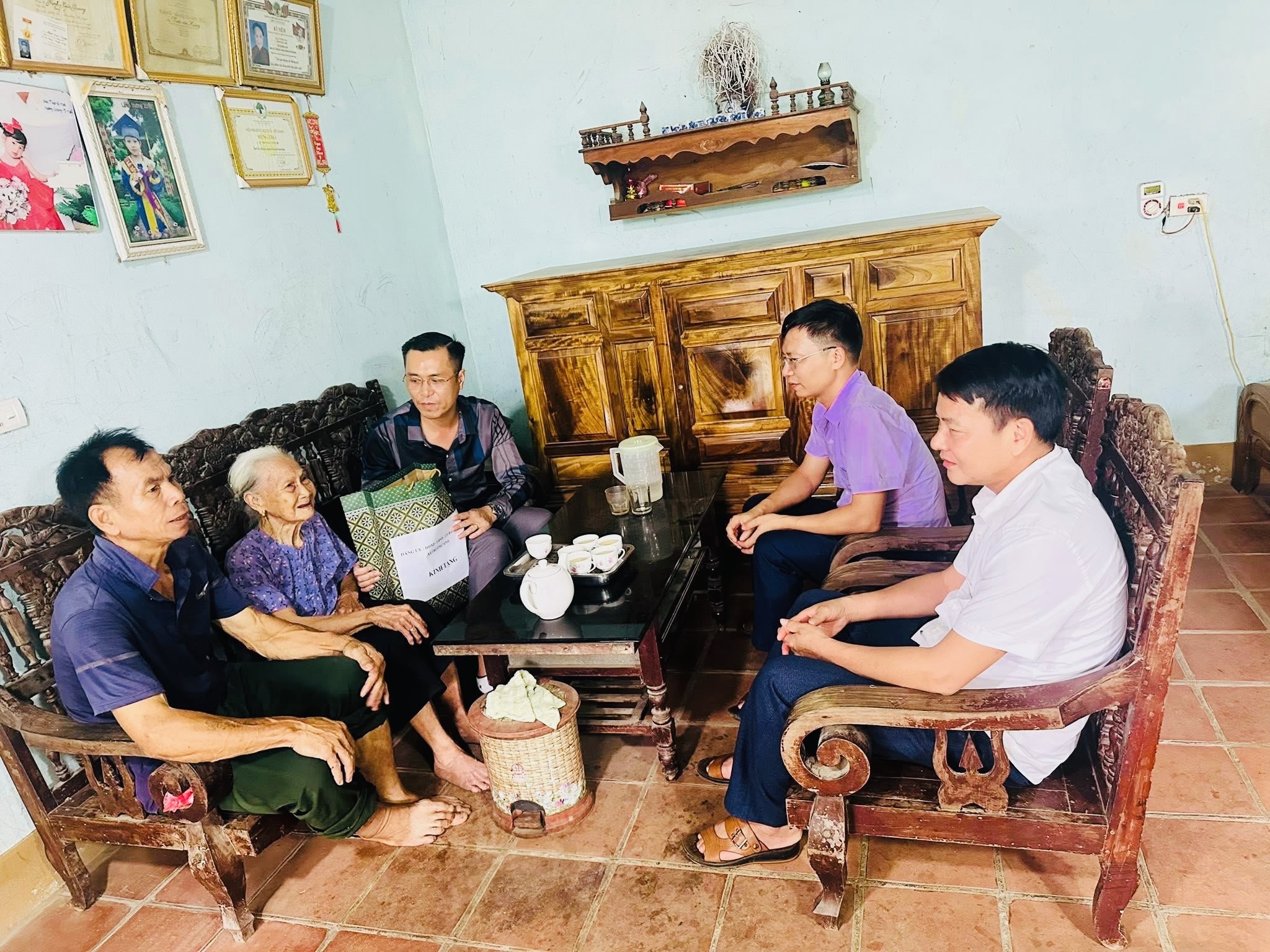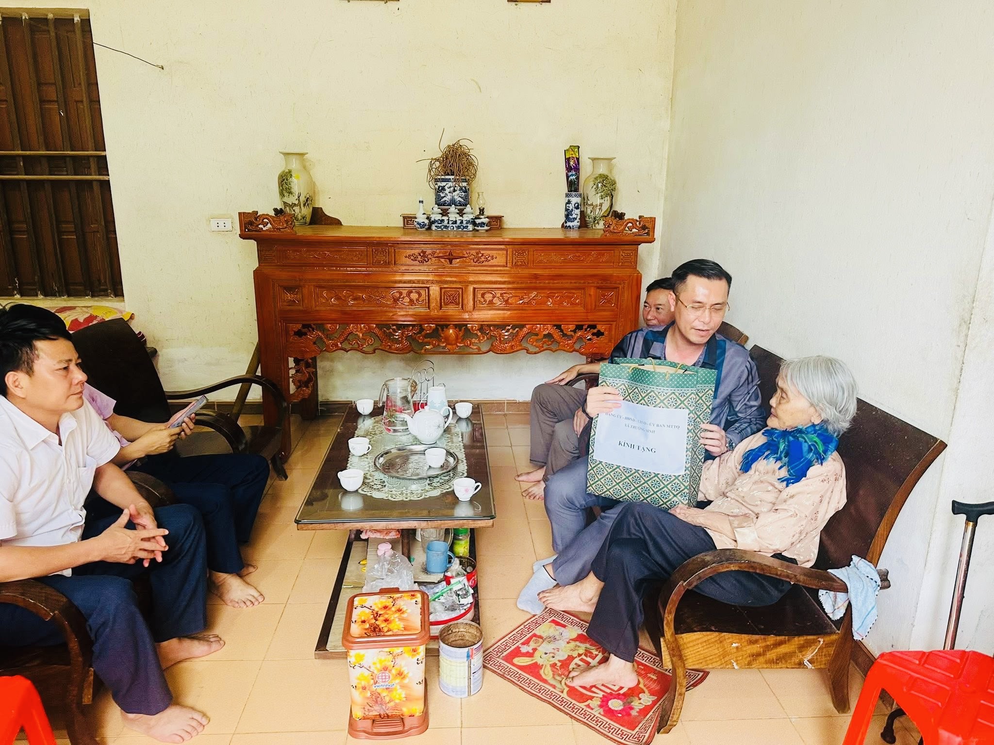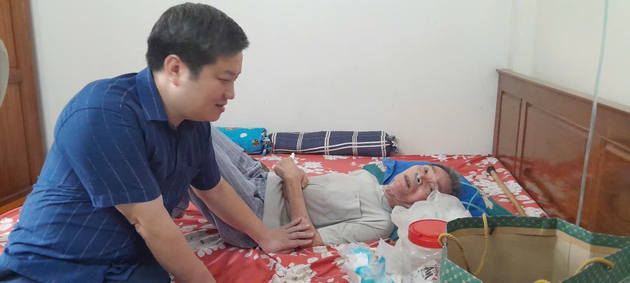 Đ/c Dương Thị Phương Nhung, UV BTV Đảng ủy xã cùng các đồng chí Chu Thị Mộng Huyền, Trưởng phòng Văn hóa-Xã hội, đ/c Nguyễn Văn An, Trưởng phòng kinh tế thăm và tặng quà gia đình ông: Ngô Thế Vinh, thương binh, người nhiễm CĐHH, thôn Thái Thịnh