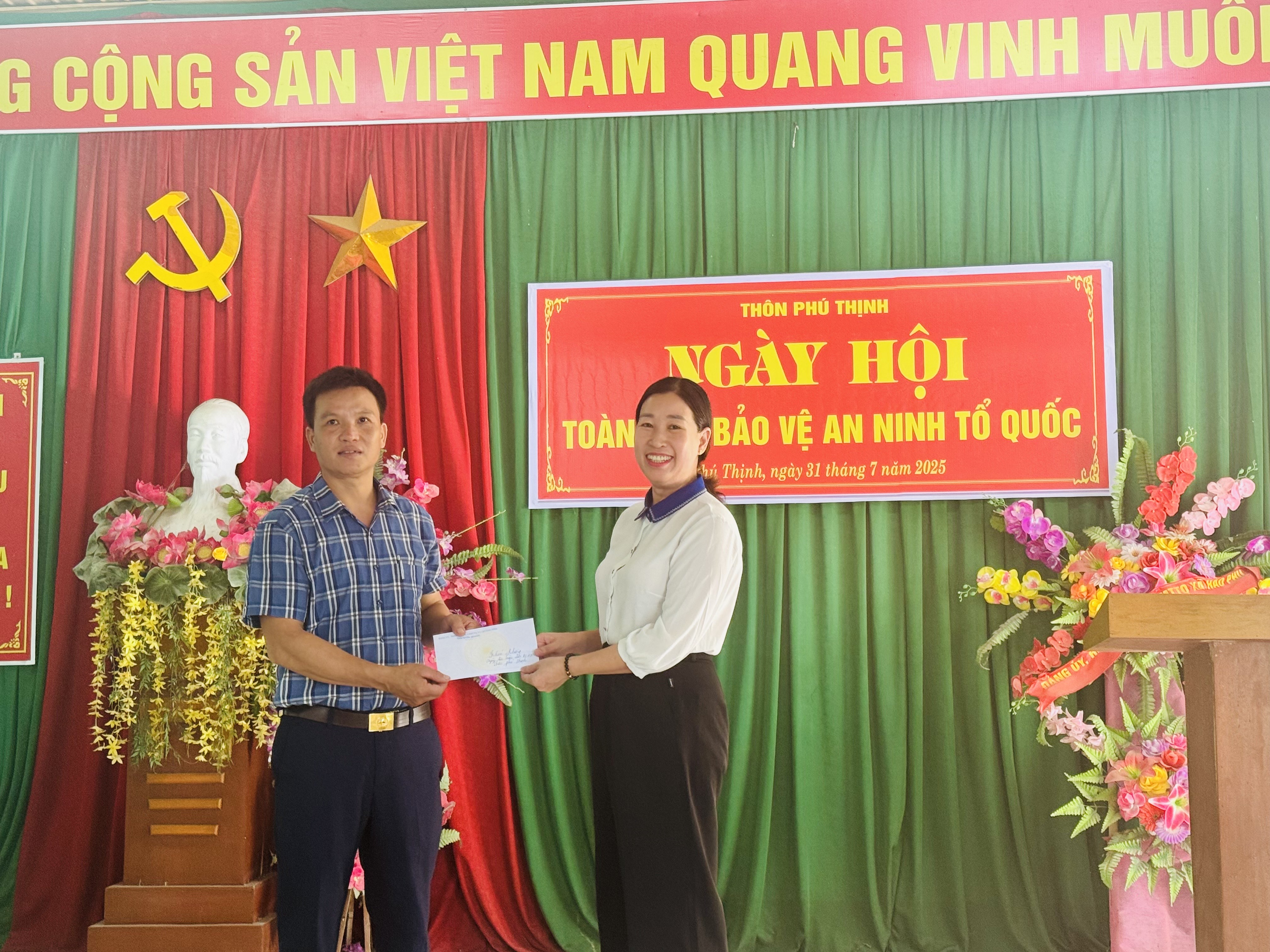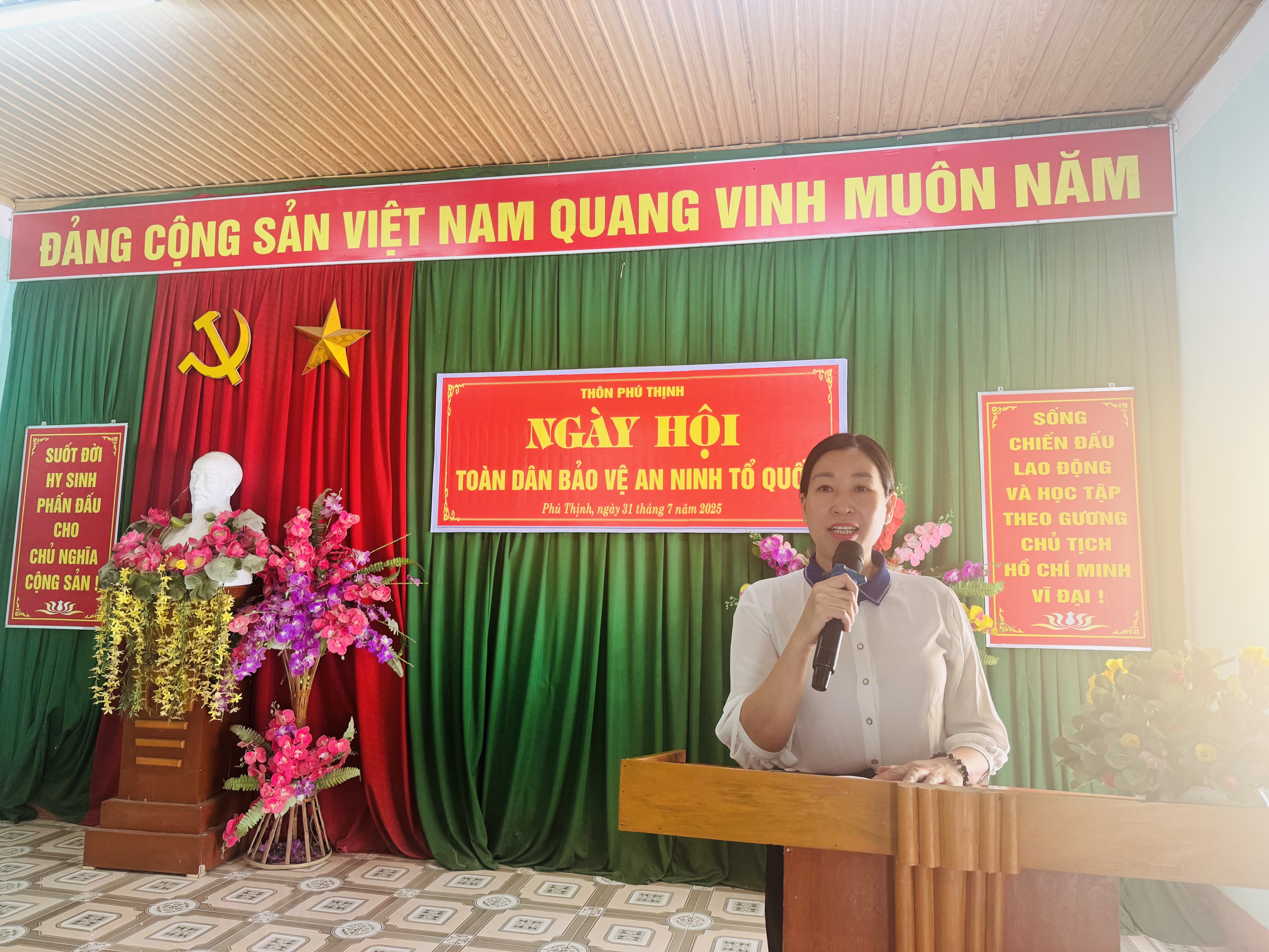 Đ/c Chu Thị Mộng Huyền, Đảng ủy viên, Trưởng Phòng Văn hóa - Xã hội phát biểu và tặng quà cho thôn Phú Thịnh