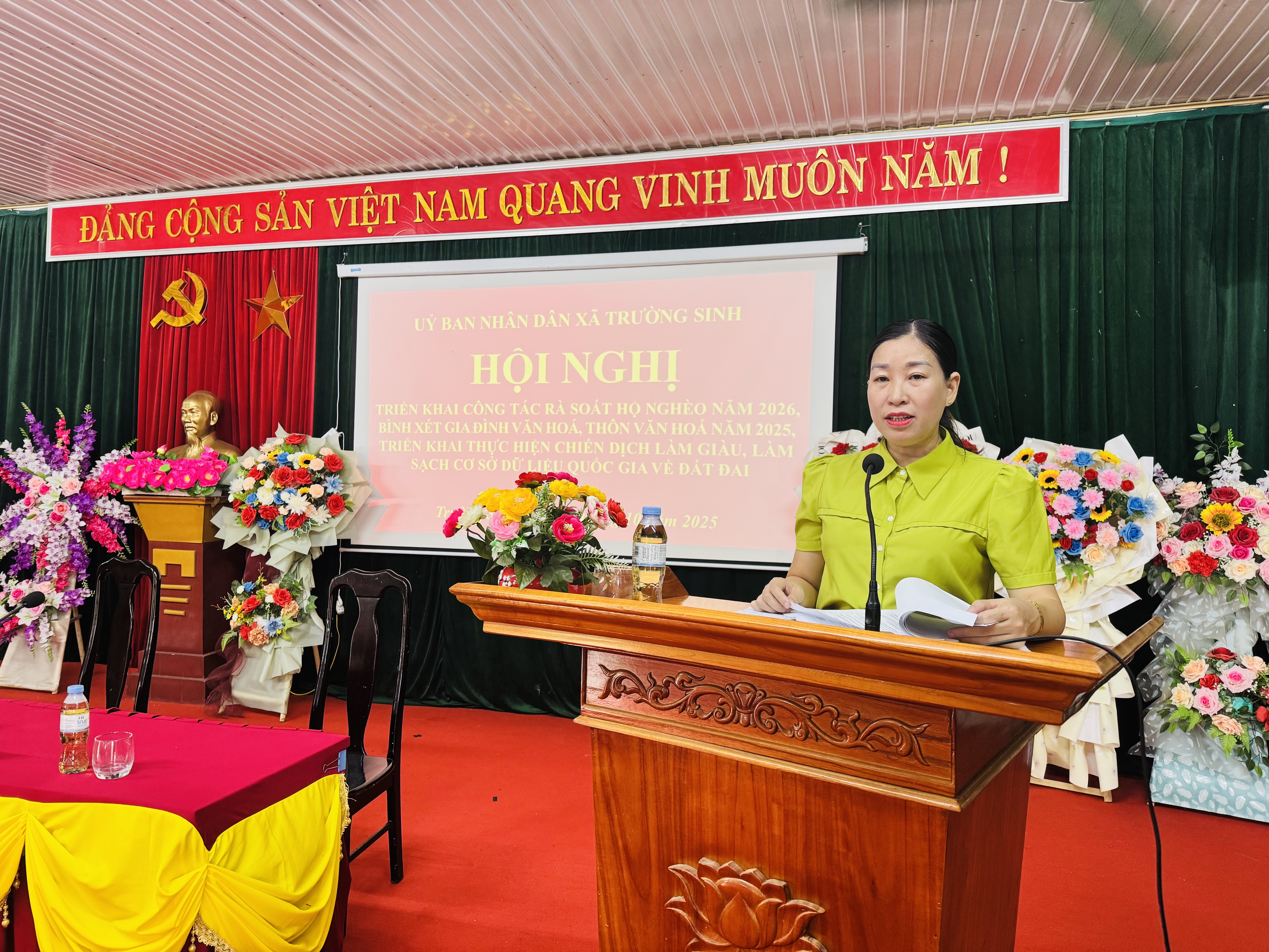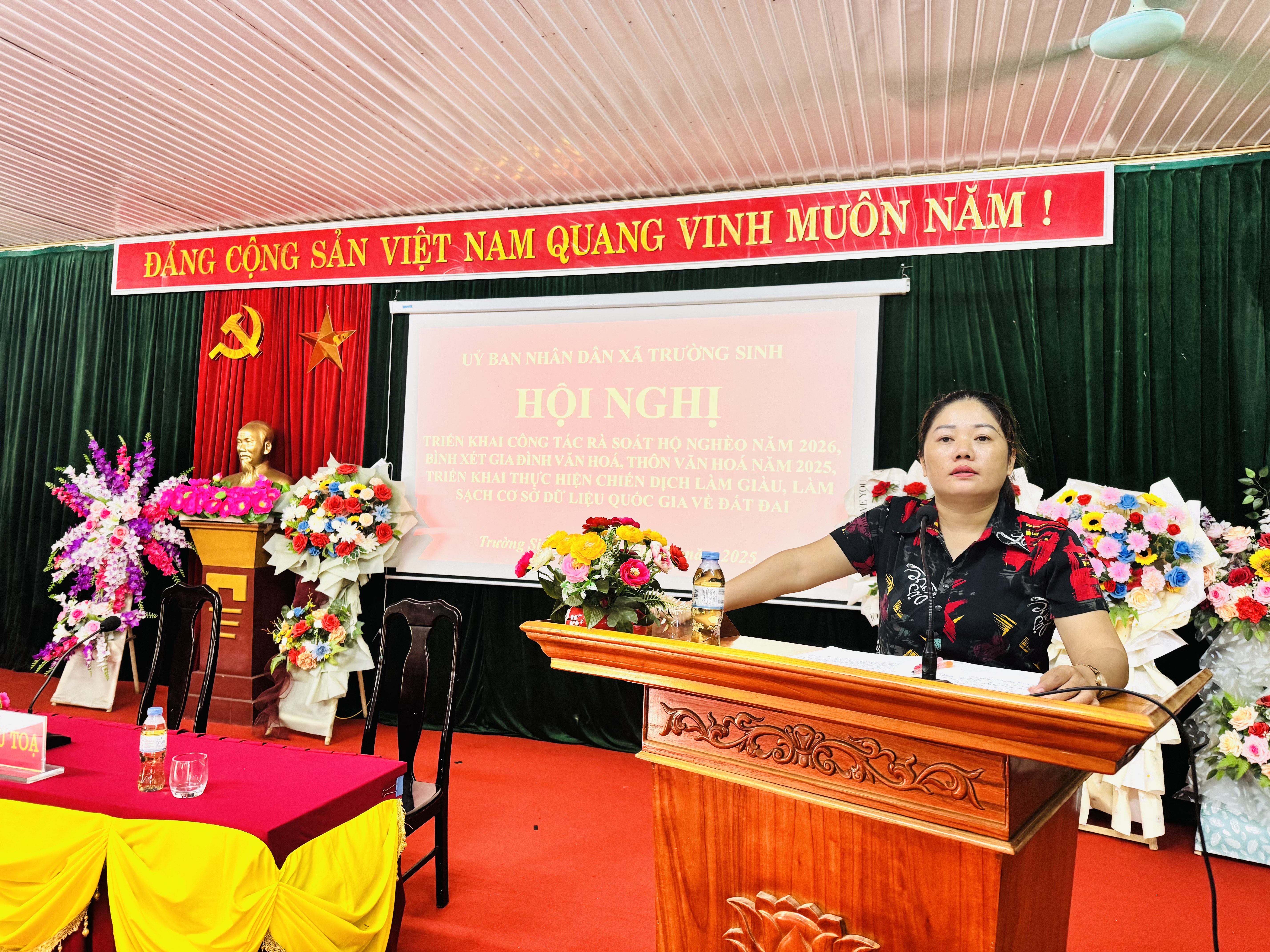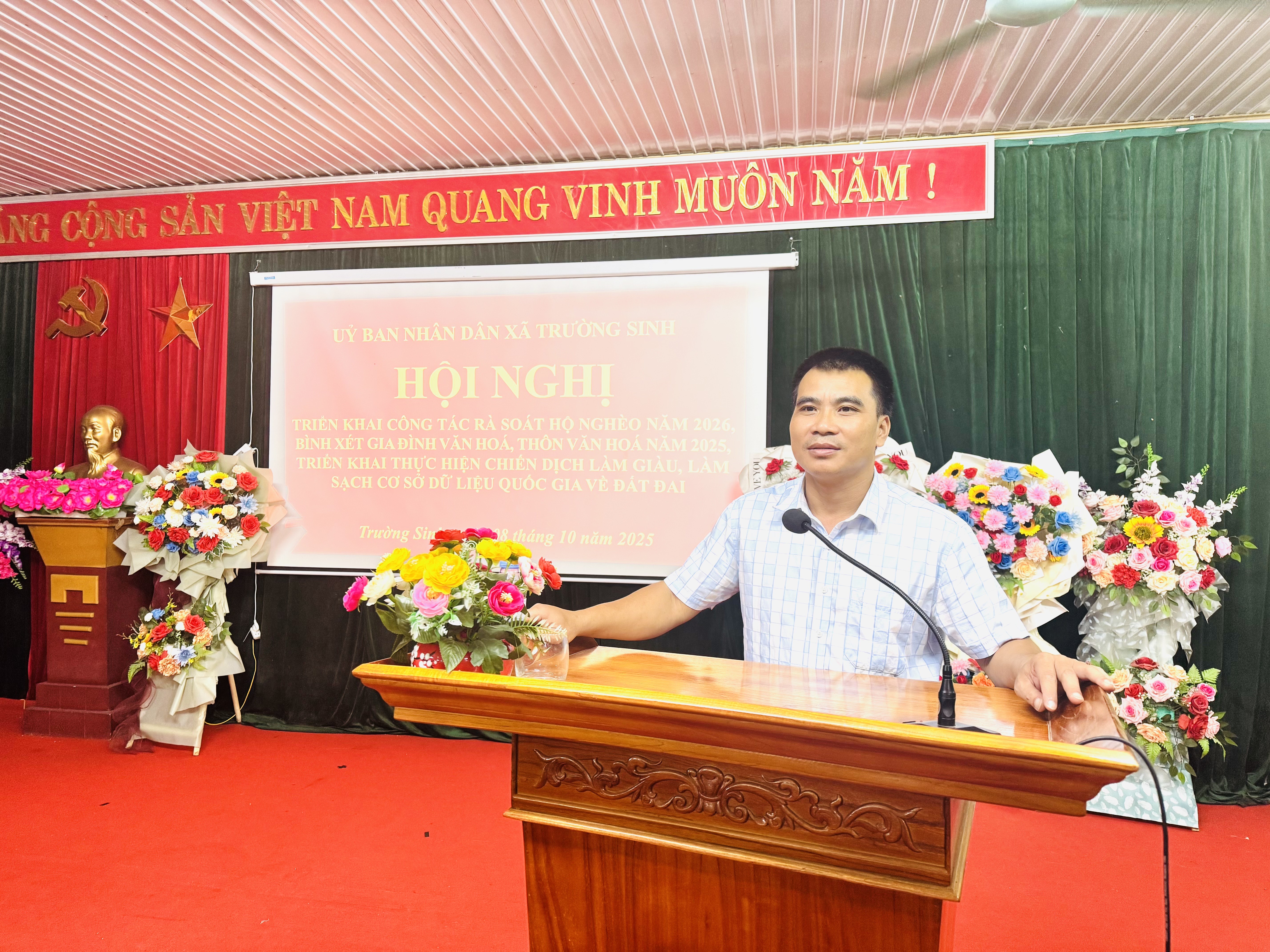 Sáng ngày 08/10/2025, tại Nhà văn hóa xã, Ủy ban nhân dân xã Trường sinh tổ chức Hội nghị công tác rà soát hộ nghèo năm 2026; bình xét gia đình văn hóa, thôn văn hóa năm 2025; Ban chỉ đạo triển khai thực hiện chiến dịch làm giàu, làm sạch cơ sở giữ liệu quốc gia về đất đai. Tại hội nghị các cơ quan, đơn vị hướng dẫn các thôn quy trình, phương pháp, bộ công cụ rà soát, phân loại hộ nghèo, hộ cận nghèo năm 2026 và hộ thoát nghèo năm 2025 theo Kế hoạch số 38/KH-UBND ngày 23/9/2025; Hướng dẫn các thôn cách chấm điểm bình xét "Gia đình văn hóa", "Thôn văn hóa" năm 2025 theo Kế hoạch số 48/KH-UBND ngày 07/10/2025; Hướng dẫn số 2069/SNTMT-QLĐĐ ngày 03/10/2025 của Sở Nông nghiệp và Môi trường tỉnh về tổ chức triển khai thực hiện Kế hoạch số 77/KH-UBND ngày 28/9/2025 của UBND tỉnh về việc triển khai thực hiện chiến dịch làm giàu, làm sạch cơ sở giữ liệu quốc gia về đất đai trên địa bàn tỉnh Tuyên Quang.
