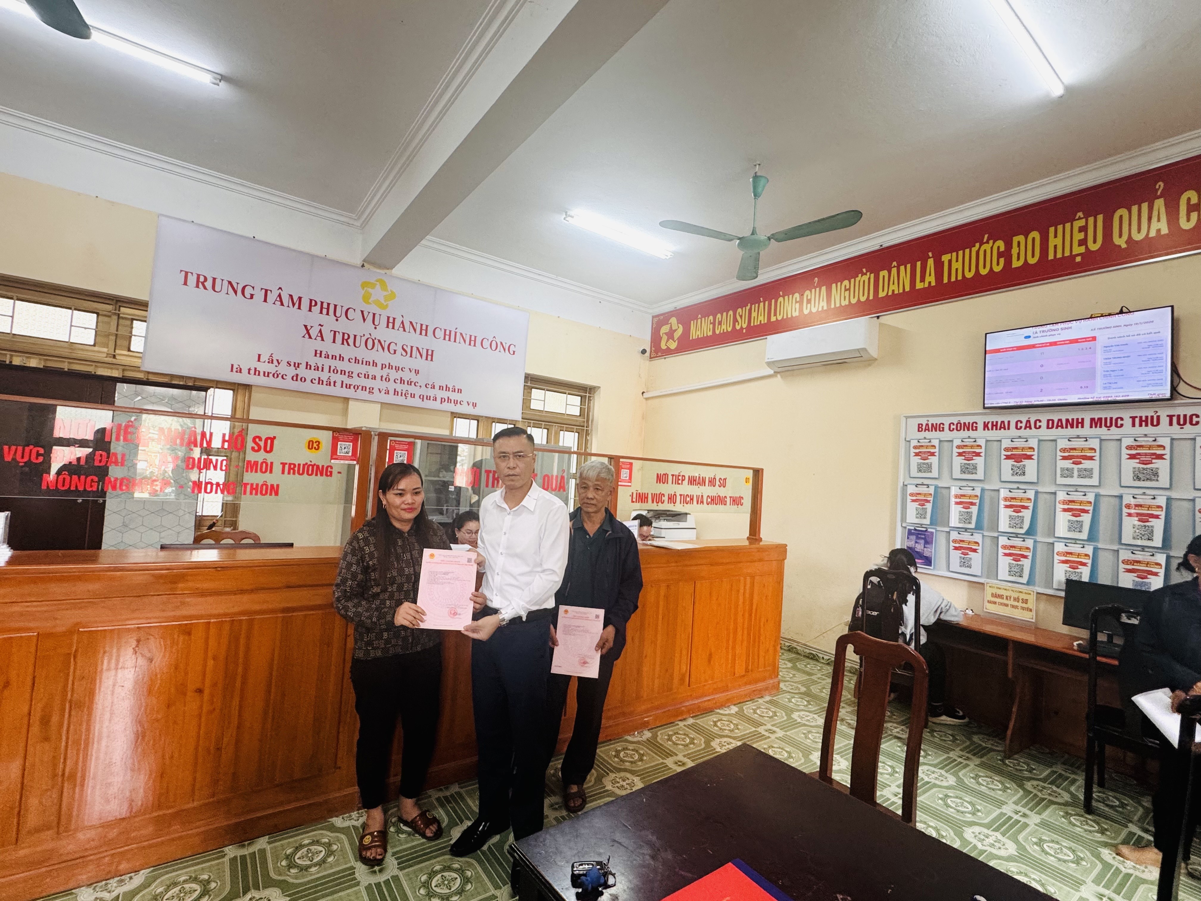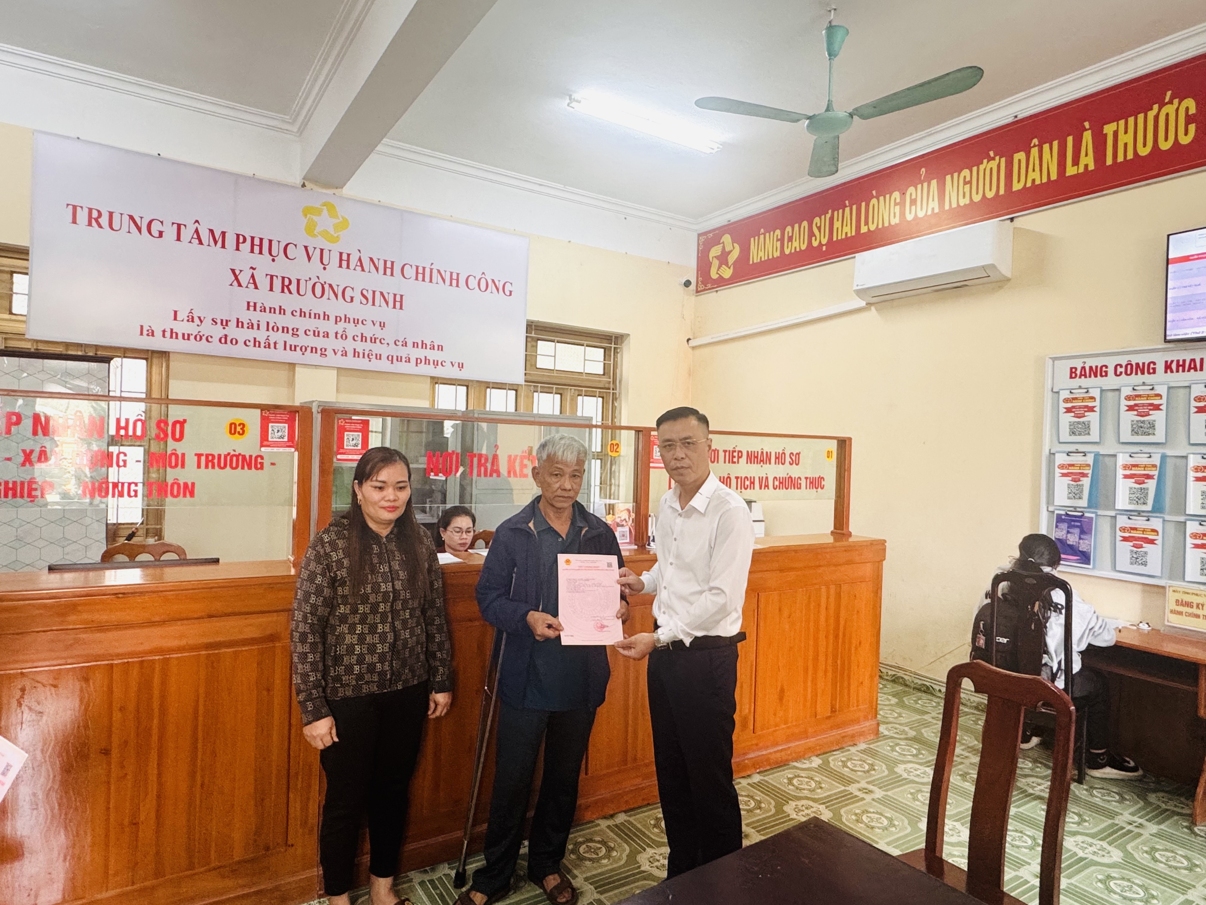 Chiều ngày 19/01/2026, tại Trung tâm phục vụ hành chính công xã Trường Sinh, đồng chí Trần Trọng Phi Trường, Phó Bí thư Đảng ủy, Chủ tịch Ủy ban nhân dân xã Trường Sinh trao giấy chứng nhận quyền sử dụng đất cho 02 hộ dân thuộc thôn Trại Mít và thôn Đồng Phú trên địa bàn xã.